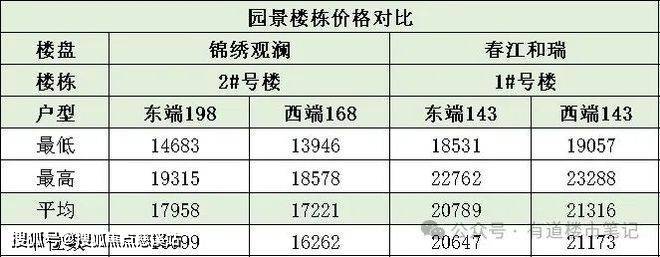 从楼盘价格对比看,春江和瑞一线看江楼栋7号楼东端均价比锦绣观澜11号楼东端高出4883元/㎡,春江和瑞园景楼栋1号楼东端均价比锦绣观澜2号楼东端高出2831元/㎡,两种不同产品的价格差异在2000元/㎡左右,这种差异和春江和瑞1号楼的位置和户型有很大的关系(东面为超高层建筑+143户型)。