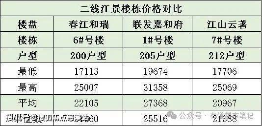 在看四个楼盘的一房一价表,还发现了几个有趣的地方。一线看江楼栋相同户型最低价和最高价相差有9200-12000元/㎡,园景楼栋最低和最高相差4200-4600元/㎡,一线江景的价格因楼层不同造成了完全不一样的视野体验,价差拉大很多。