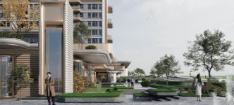 采取围合式布局,打造约7500㎡中央花园,楼栋可共享中央景观,布局“一带一环一轴”景观体系,构筑云台森境,抬高式设计让首层架空层与社区花园连通,融合园景与七里河风光。