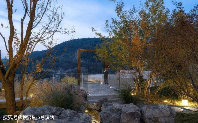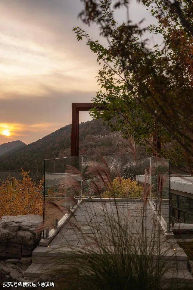 穿过月洞门,漫步青石板道,视线豁然开朗。寻水声而至景观挑台,临崖远眺,晴空远山、落日余晖,尽在眼底。置身其中,感受人与自然的互动,体验四时变话和内心的静思。