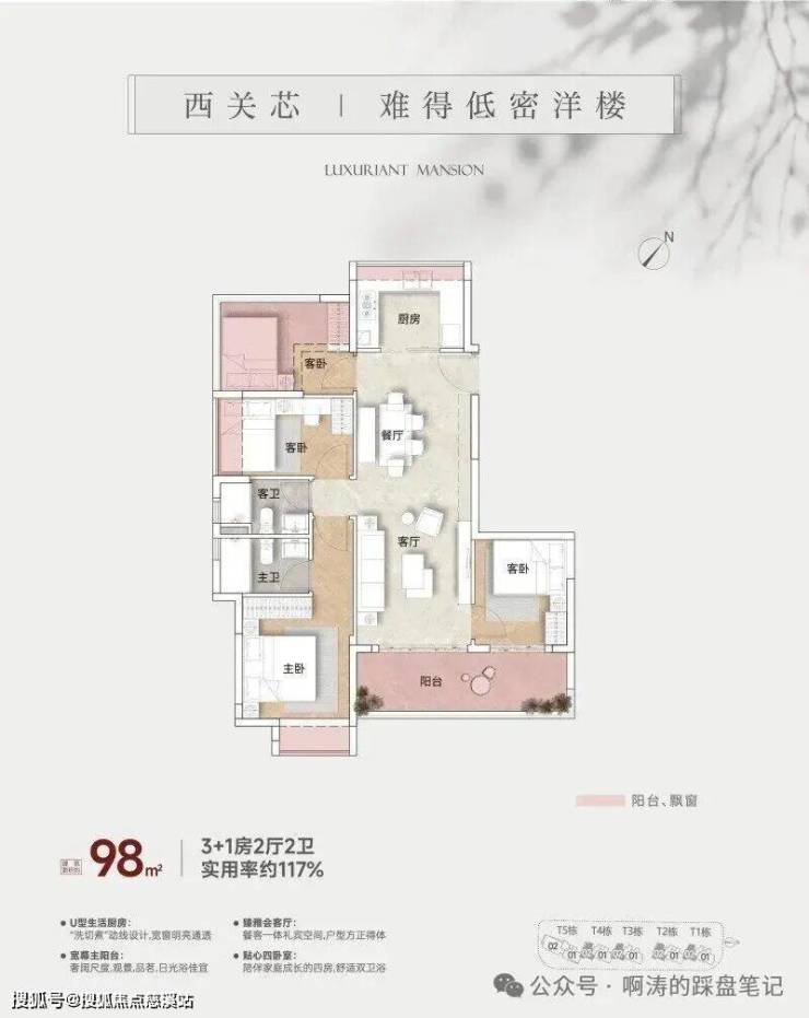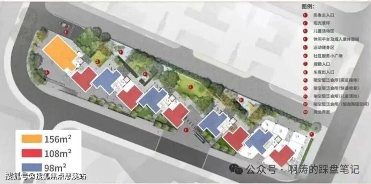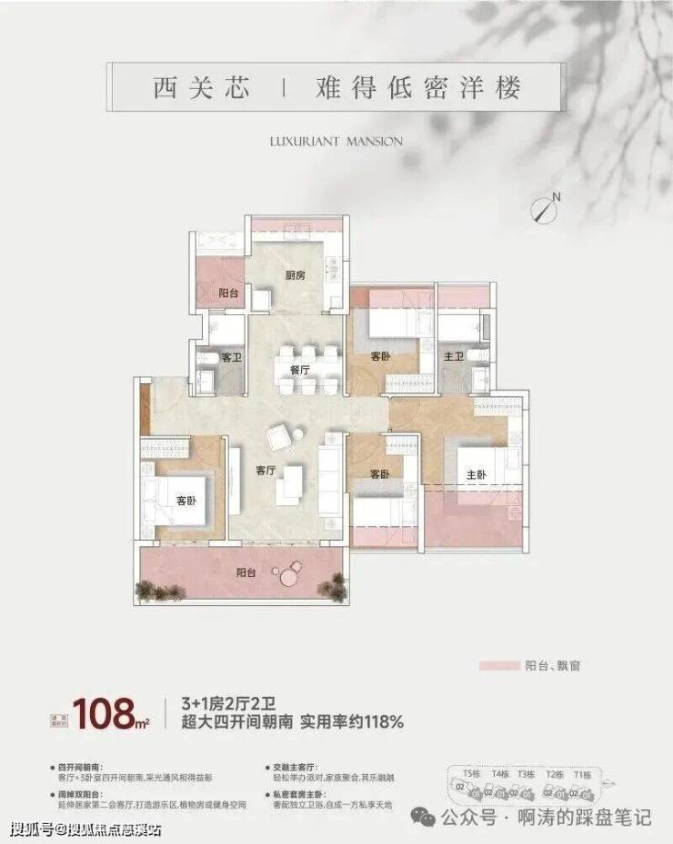 整个项目有5栋10层南向板楼,三个户型分别是98平、108平和156平,全四房设计。