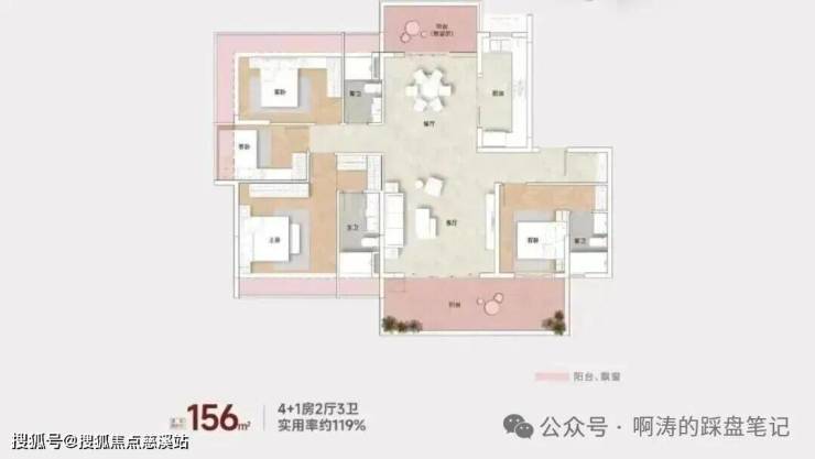 最稀缺的约156平四房,可以扩展成4+1房2厅3卫的格局。