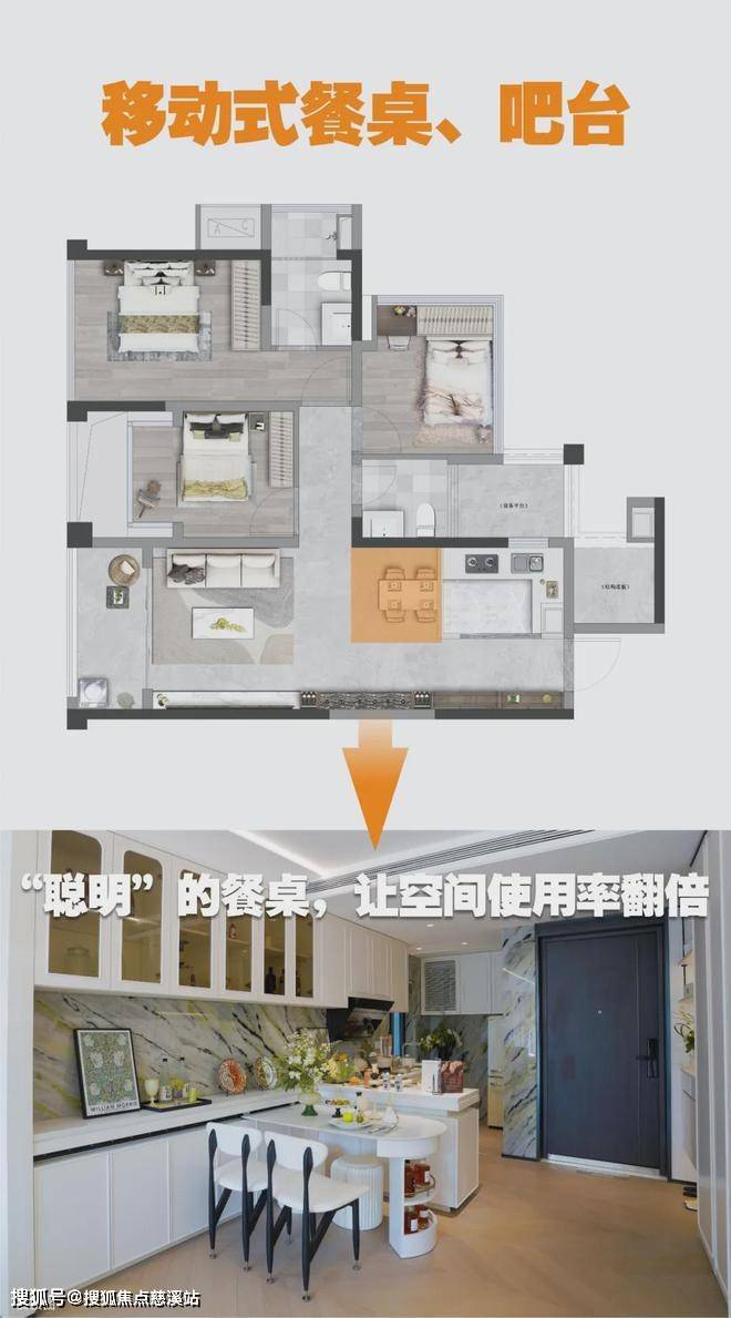 转身来到餐厅区域,你会发现一个巧妙的设计——移动式餐桌+吧台。一个人的时候,可以在这里享受大空间里的美食时光,享受那份宁静与自在。当朋友到访,这张桌子便成了聚会的中心,自由移动,轻松容纳三五好友的聚餐。而吧台,更是这个空间的亮点,白天是咖啡的香气,夜晚则变身为小酌的天地,日咖夜酒,通通搞定。