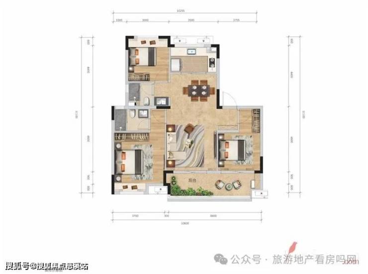 六期洋房A户型:建面约108㎡, 三房两厅两卫。户型方正,南北通透,一层花园约30㎡,带宽景阳台,采光充足。