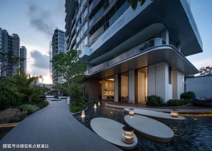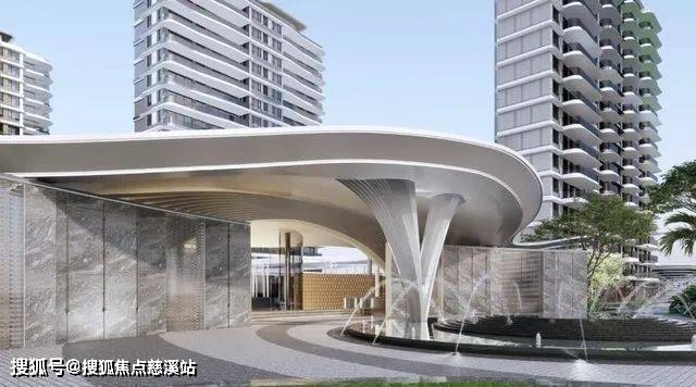 保利・海晏,灵感源自海浪,以豪宅的流动线条为造型,塑造出优雅的琉光立面。这座如雕塑般优雅的建筑,其圆弧造型赋予建筑浓郁的度假氛围。在项目主入口处,设有前场酒店式环岛落客区以及无雨落客区,从主入口至泛会所,则由风雨连廊加以串联。