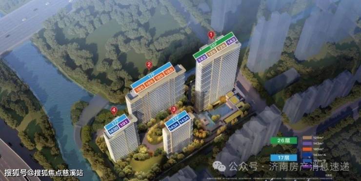 1号楼,总高26F高层,两梯四户,边户面积约为143㎡,中间户约为125㎡,首层层高3.15m,标准层(含顶层)层高3m;