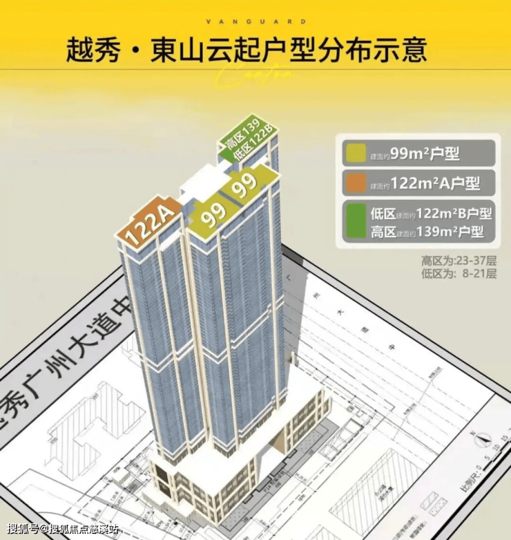 越秀东山云起项目总高37层,其中1-6层为配套设施,7层和22层为架空层,从8楼开始才是可售的住宅单位,项目周边基本都是楼龄比较旧的二手,所以这116套新规住宅注定会很抢手。