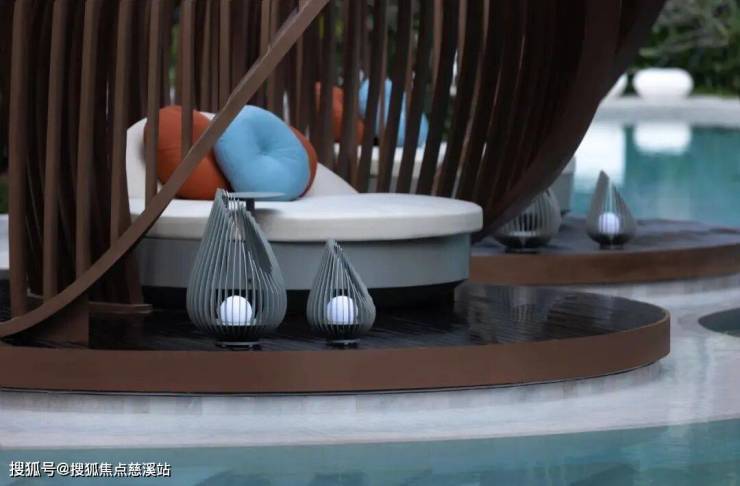在繁密丰富的雨林生态背景中,设计团队通过凝练、纯粹的设计语言,用极简的线条,来打造由林入水间的视觉层次。选用西班牙知名家具品牌VONDOM的Pillow系列,以其独特的体块感,在自然度假的场景中塑造独立的岛屿。