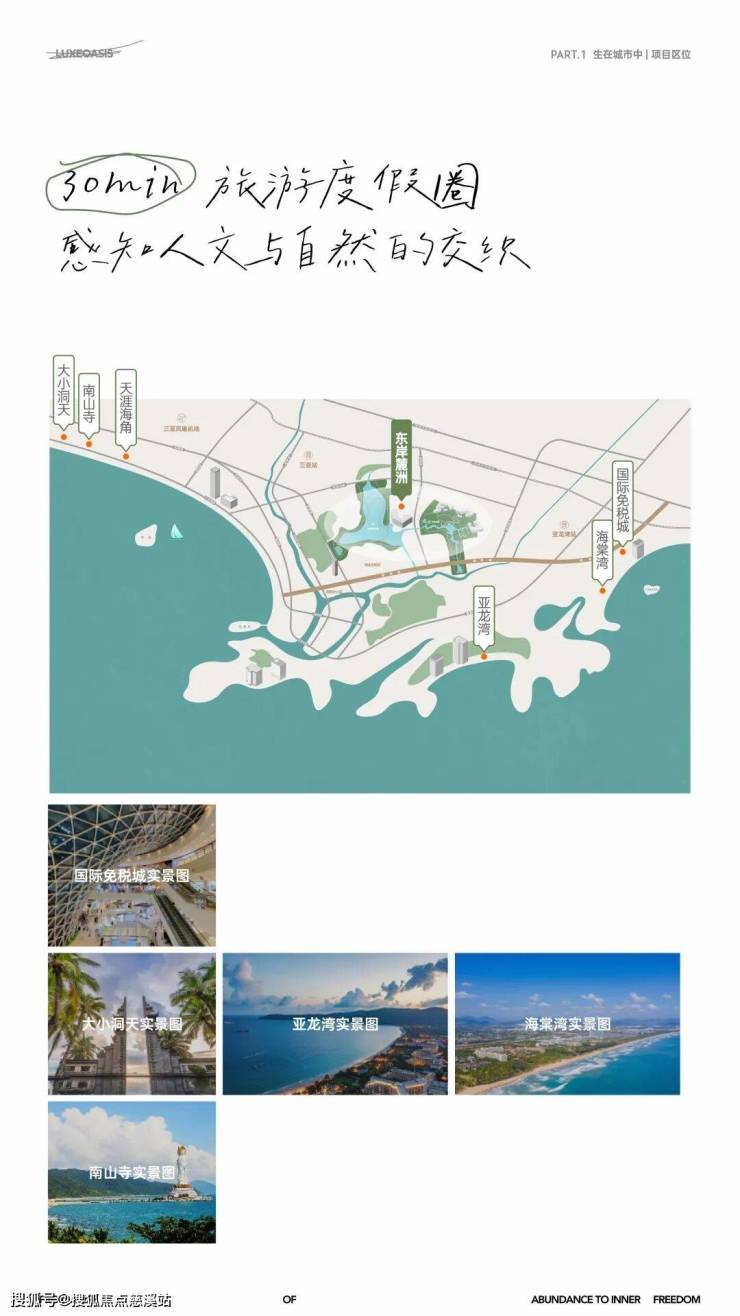 • 周边配套:交通上,北临迎宾路,向西25分钟可达三亚凤凰国际机场,向东衔接环岛高速,距离三亚动车站仅约5公里。教育上,3公里内有55所幼儿园、12所小学和8所中学。医疗上,3公里内有33家医院,包括三亚中心医院等三甲医院。商业上,与三亚大悦城商圈无缝衔接,1公里内可直达海旅免税城。生态上,西侧紧邻东岸湿地公园。