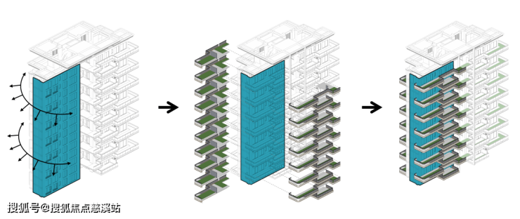 通过连续通长跑道式空中花园,形成了近22m长的空中连廊,创造出尺度宽阔、情景宽广的体验自然的居家生活场景。