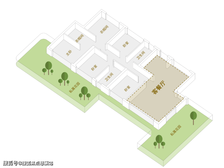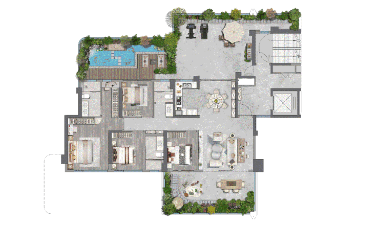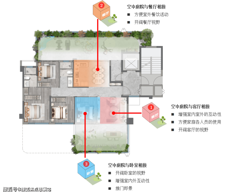【三木乐府】在产品设计上巧妙融合了室内功能与空中花园的景观,创造了一个立体的花园空间。这不仅仅是简单地扩大阳台或露台的面积,而是通过空中花园的设计引发了一场「户型创新」。这种设计突破了传统的户型结构,使得客厅、卧室与空中花园相互融合,模糊了室内外空间的界限。