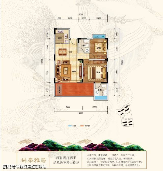 林泉雅居:面积83.53-85.43㎡,赠送12㎡,分布在1#2#3#5#15#16#17#18#19#楼,为两室两厅两卫,明厨明卫,方正、紧凑,布局合理。阳台上设置温泉泡池,