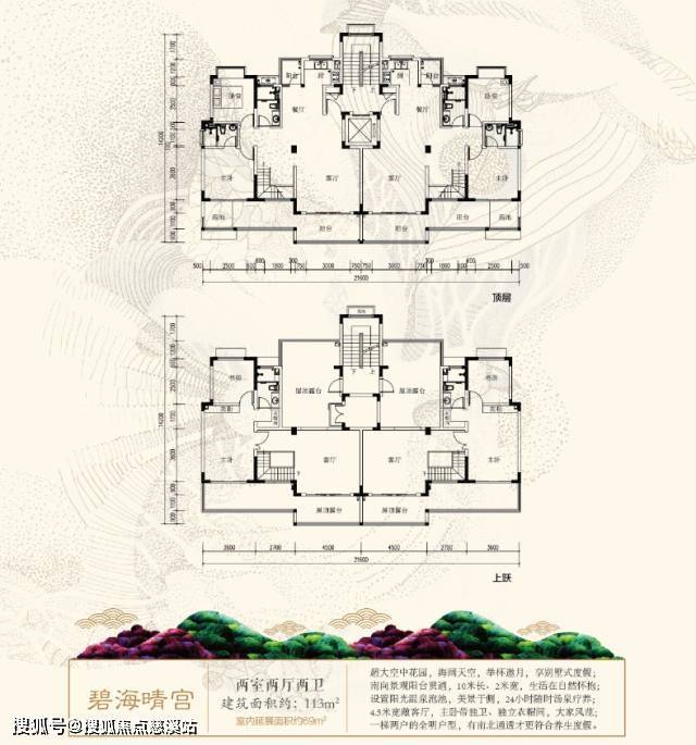 顶层为113㎡+16㎡(赠送)两室两厅两卫,上跃为69㎡(赠送)两室一厅一卫+48㎡(赠送)超大露台。