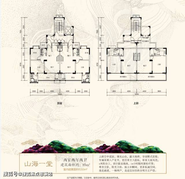 顶层为85㎡+12㎡(赠送)两房两厅两卫,上跃为55㎡(赠送)一房一厅一卫+25㎡(赠送)超大露台