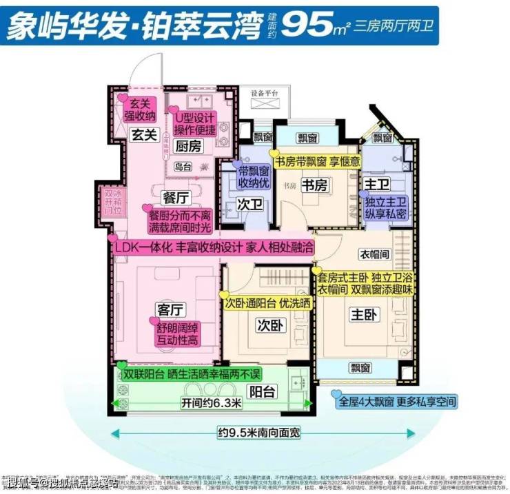 在空间尺度上,95这个户型面宽接近9.5米的,采光效果良好!