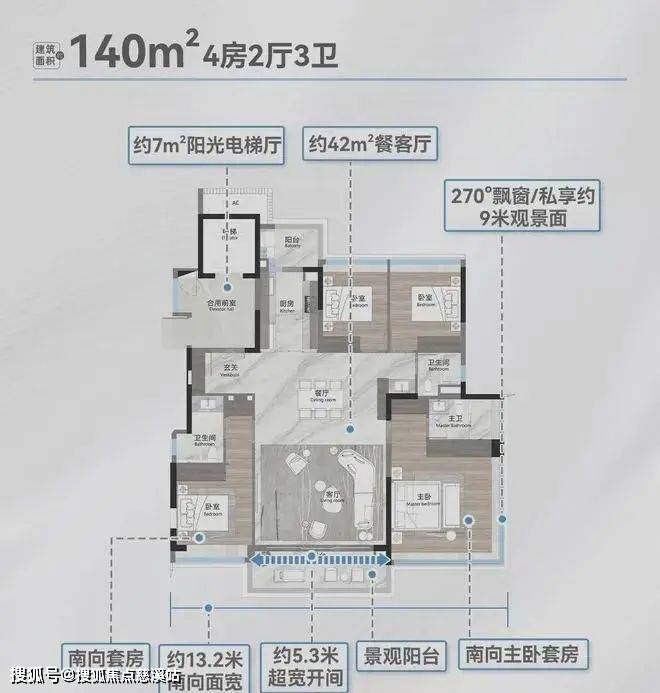 户型赏析: 建面140平四房三卫,入门级户型,部分也可望到湖景,双套房设计,南向开间,两个次卧之间没有承重墙,打通后可做成3个套房,另外独梯入户,全屋12%收纳比,配置超大玄关柜