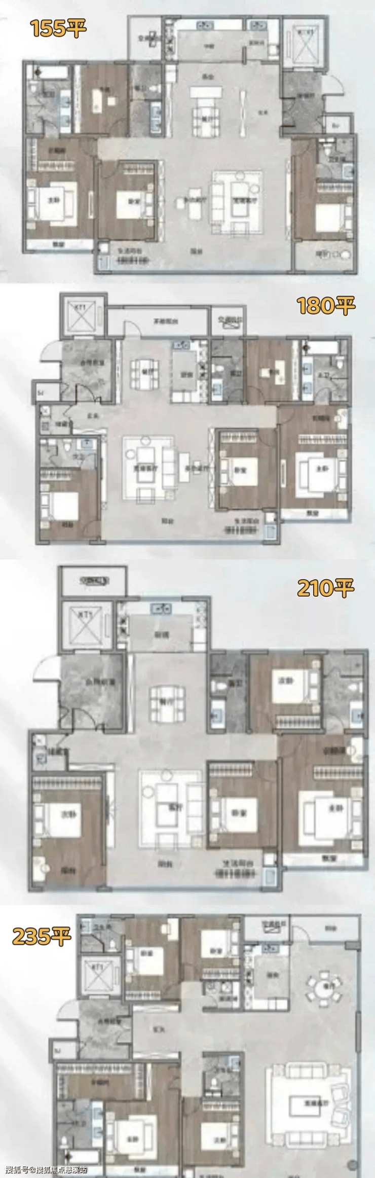 项目主力户型155-235平,还有部分300平大平层。(⚠️户型图非正式版本,为前期概念,仅作为参考,正式户型图还没有公布)