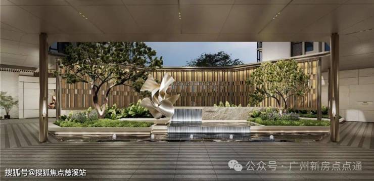 ✅感官进阶→迎宾水幕,寓意万紫千红艺术雕塑搭配蓝翡翠仿石砖+冬青树🌳荔枝纹锻金弧形屏风&风雨连廊🍃