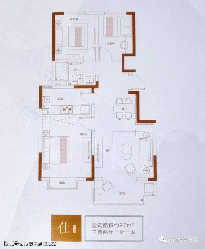 值得注意的是,96平三室两厅的户型仅有一室一厅为南侧朝阳。