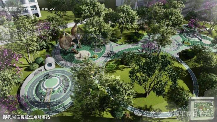 约8500㎡台地景观,约5000㎡艺术庭院,约1000㎡ 全龄活动场,约1公里跑道,约1000㎡ 森系花园。