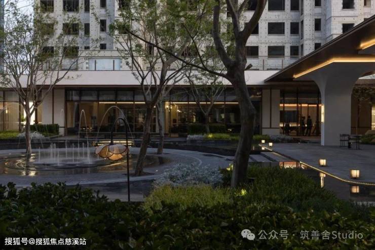 融合四颗精选朴树,旱喷广场打造出中心聚合的舒适空间,营造出轻松愉悦的生活烟火气息。