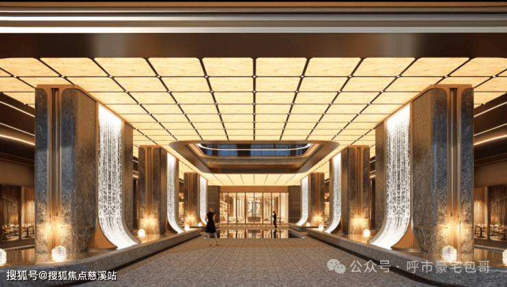 天井两侧为环岛落客区,精心融入照壁文化元素,巧妙地营造出“藏而不露”的含蓄美感,让每一位归来的业主都能感受到浓厚的文化底蕴与归家的尊崇仪式感。