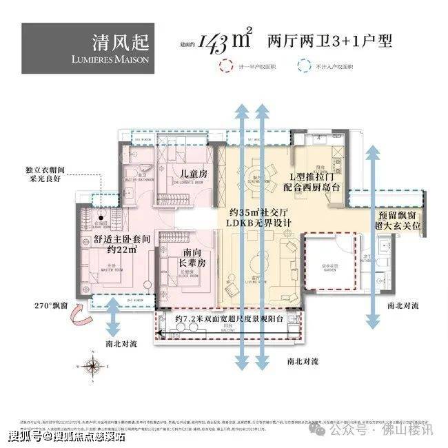 万科世纪灯湖瑧府的户型设计,精准贴合改善型家庭对“空间尺度”与“居住体验”的双重需求:如143㎡3+1房两厅两卫:南北对流格局,南向采光面达15.6米,约7.2米双联阳台可270°环幕观景,主卧套房配备独立衣帽间与270°飘窗,兼具私密性与景观视野;创新类四叶草布局,减少过道空间浪费,家庭成员各有独立空间,多代同堂亦能“亲而不扰”。