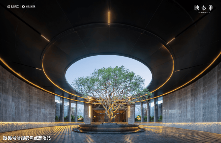 它的设计灵感源自南京六朝古都的礼制文化“一进登门望府,二进穿庭入画”,约百米宽、7米高的超常规尺度主入口, 扩大了整个楼盘的封面, 它的用材尽显奢侈——