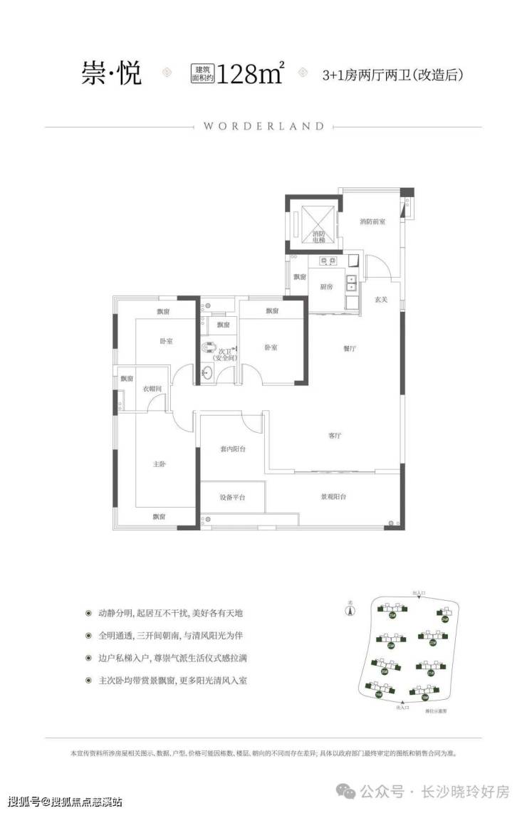 建筑面积约128㎡3+1房、约5.9m客厅开间、得房率约113%(含电梯厅)