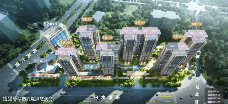 总户数:6栋住宅共652户,户型面积涵盖95-135平方米,可灵活拓展为3-6房。