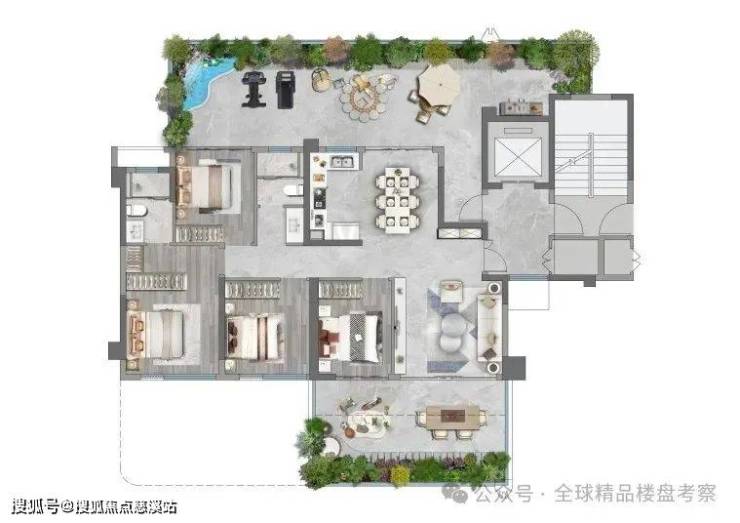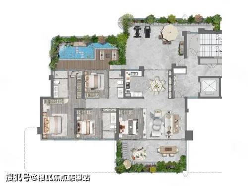区别于传统阳台进深约1.5m,三木乐府露台进深最大约5.65m,同时做到了约6m挑高。尺度升级的同时形成约270°观景视野,营造出庭院深深的空中花园体验。