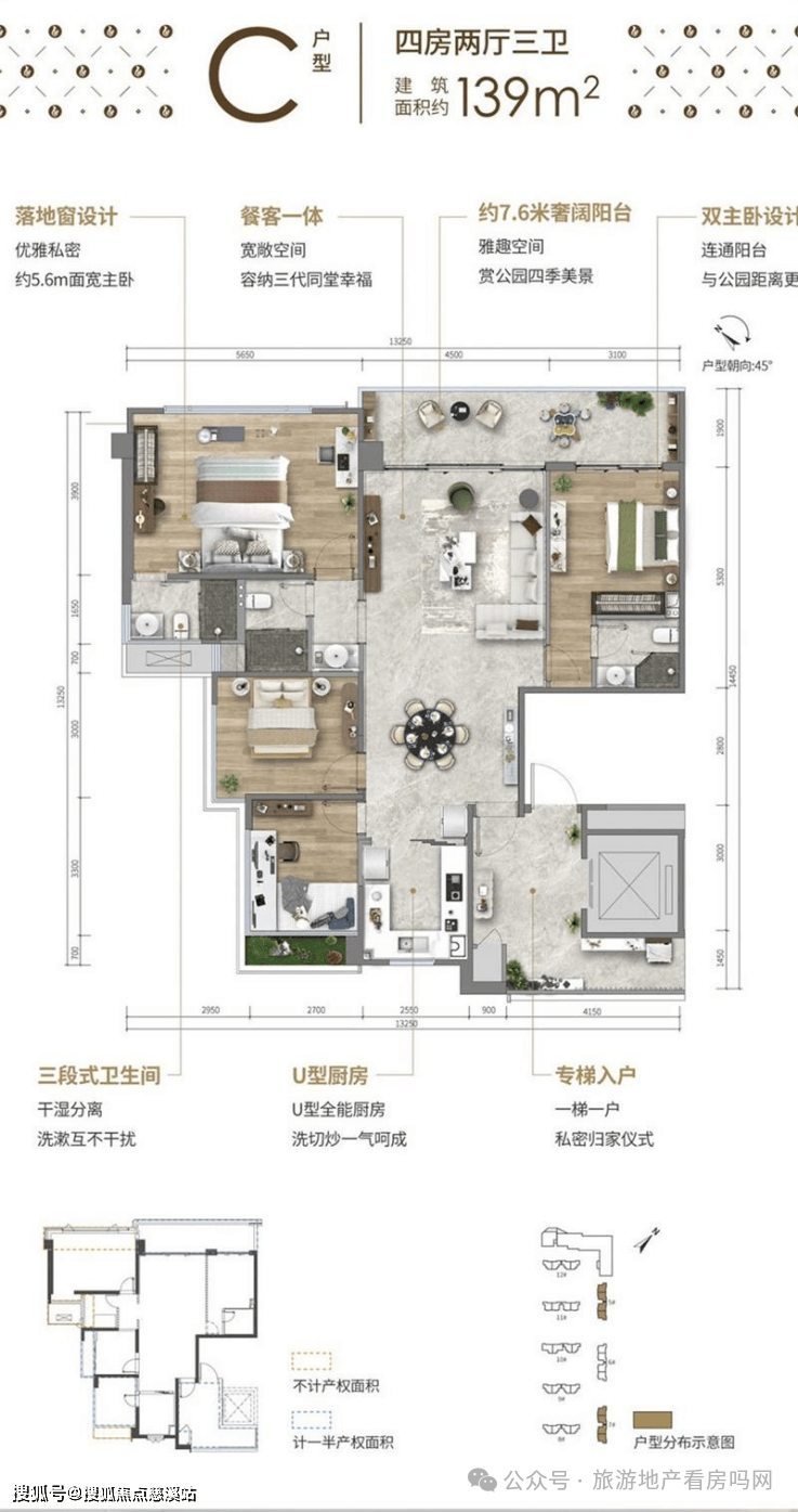 C户型:建面约139㎡,四房两厅三卫。奢阔四房,可三代同堂;双主卧设计,连通阳台,公园美景一览无遗;客餐一体,超大横厅,带7.6米阔景阳台大采光;U型全能厨房,洗切炒一气呵成。