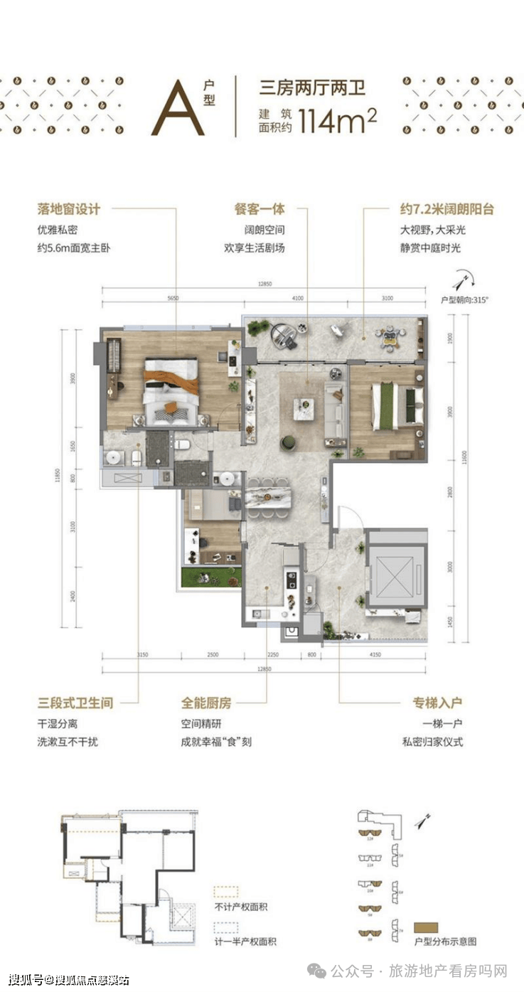 A户型:建面约114㎡,三房两厅两卫。一梯一户,户型方正,南北通透;餐客一体,阔朗空间,约7.2米观景阳台,大采光,视野较佳;全能厨房,布局合理;三段式卫生间,干湿分离;约5.6米面宽主卧,带落地窗。