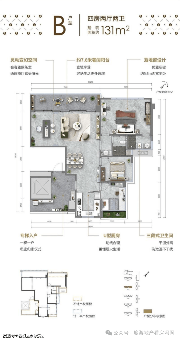 B户型:建面约131㎡,四房两厅两卫。专梯入户,布局周正,功能齐全;约7.6米奢阔阳台,与客厅、餐厅一体,通风采光俱佳;大面宽主卧,带独立卫浴,私密性强;U型厨房,动线更合理。
