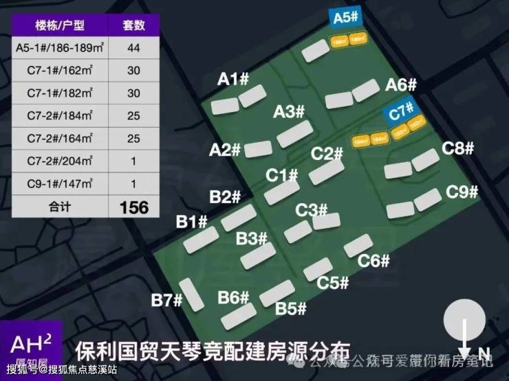 保利国贸天琴竞配建房源共156套,A5号楼1梯186-189㎡44套、C9号楼1梯147㎡1套,C7号楼162-164㎡55套、182-187㎡55套、205㎡1套。