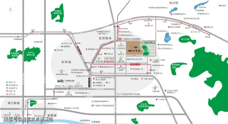 2大轨道交通+5大城市主脉:直线距离约800米地铁21号线长平站,1站黄埔区府(水西站),2站万达广场(苏元站),5站到天河(天河智慧城站);步行约400米有轨电车1号线羌洞站,1站换乘21号线;广州绕城高速、香雪大道、广汕公路、开创大道、开萝大道等主干道。