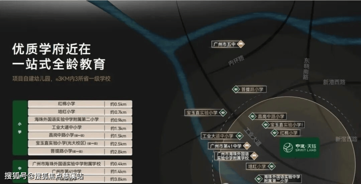 项目自带一所幼儿园,小学以上就要依赖周边,距离最近的公办小学是海珠区金碧第一小学(西校区)和海珠区石溪劬劳小学,两所小学对口初中分别在第五组和第七组