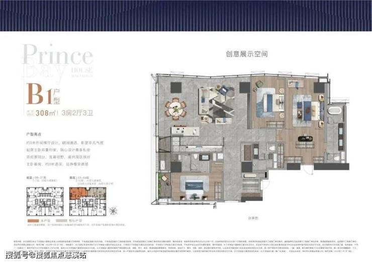 项目打造主力建面约308-415㎡纯粹品质公寓共191席,顶层为建面约1280㎡山海大宅。