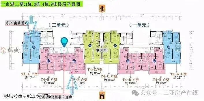 高层住宅楼的平层内依据规划建设的不同被分别设计为两梯三户和两梯四户,以平层内设计为两梯四户的住宅楼为例,属于平层内边户的房型,属于南北通透的纯板式格局,属于平层内中间户的房型,因为其北侧衔接连廊。所以在降低了室内部分房间私密性的同时,整体提升了该套中间户的室内通风和采光性能。