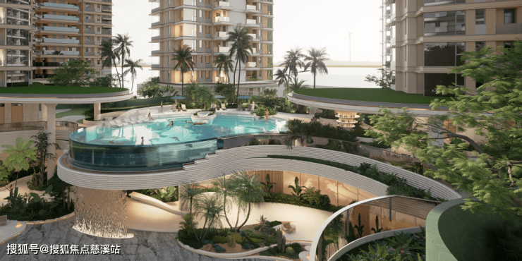 以超前手法打造约320㎡无边际悬空泳池,通过流水叠瀑链接负一层会所,于此可举办落日派对、池边社交,生活场景由此无限延