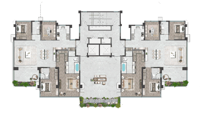 大平层本身就贵,将庭院融入大平层,且位于市中心,价值更是「恒产」。一层一户,建面约370平“无界”空间,通过四方围合的领域划界,恢弘尺度的拓展,用一座空中四合院,重现多代同堂的传统家族居住观,实现了对鼓楼中心资源的绝对占有。