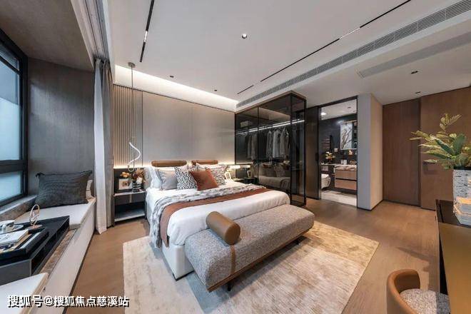 主卧套房设计,带有大飘窗、衣帽间、卫生间。主卫的马桶和台盆都是是唯宝、杜拉维特或同等档次品牌;龙头、花洒是高仪、汉斯格雅或同等档次品牌;台盆柜和镜柜是博洛尼或同等档次品牌。