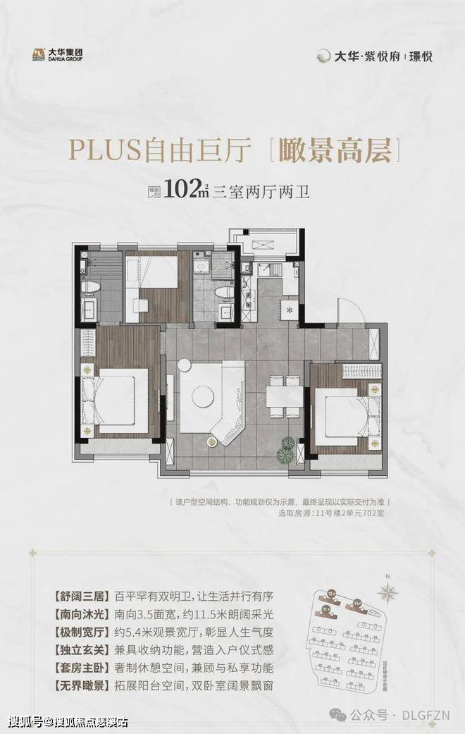 面积:102平(三室两厅两卫)客厅开间:5.4米