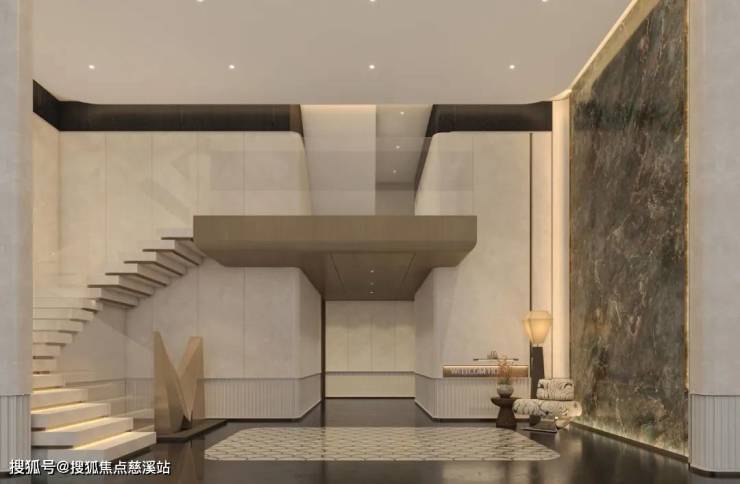 可在金茂·泮湖满庭,洋房大堂做成两层通高,侧面一部艺术性的「钢琴键」楼梯通向二层悬挑平台。