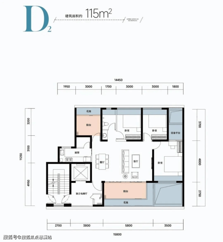 🏠D2户型:约115㎡四房两厅两卫