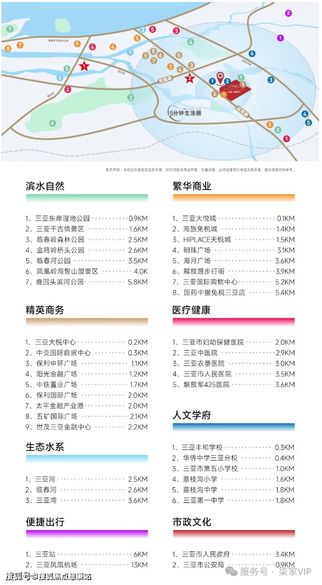 小易拿到的项目资料,也将周边的配套梳理的很全面,大悦城、免税城、中医院、华侨中学三亚分校等商业、医疗、教育配套基本上是三亚主城区的顶配;