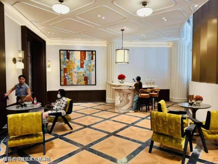 和煦系本身标配酒店式归家大堂与会所,天津市场流行的架空层给保利更大的发挥空间。珺璟和煦直接将主入口延展面做到了70米,高6.2米,这个体量感放在任何大盘都足够吸睛,更何况这个小地块进深总体才150多米。