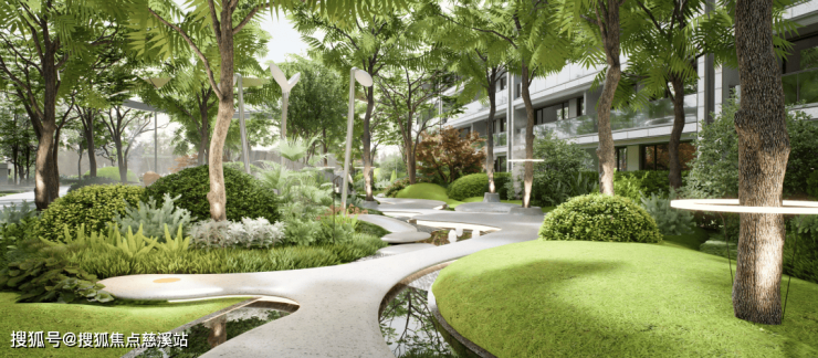 景观节点的排布并不是传统“几横几纵”的兵营式排布,而是以“嵌入咬合”的方式,将溪流、廊架、口袋花园、步径等复合在一起,让空间有了情绪的表达,更放大了园林的心理面积。
