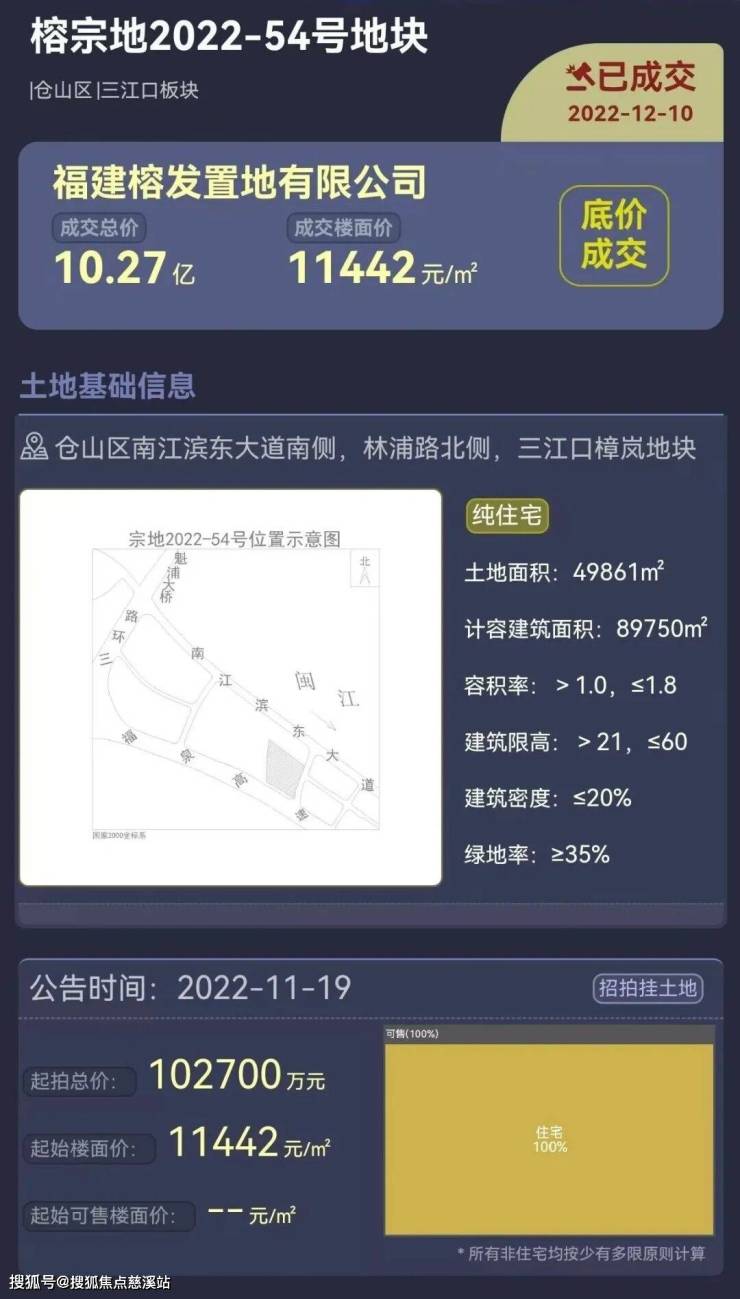 福建榕发置地有限公司于2022年10月以10.27亿竞得榕宗地2022-54号地块,楼面价11442元/㎡,底价成交。地块较方正,内部无古建、宗祠等建筑。