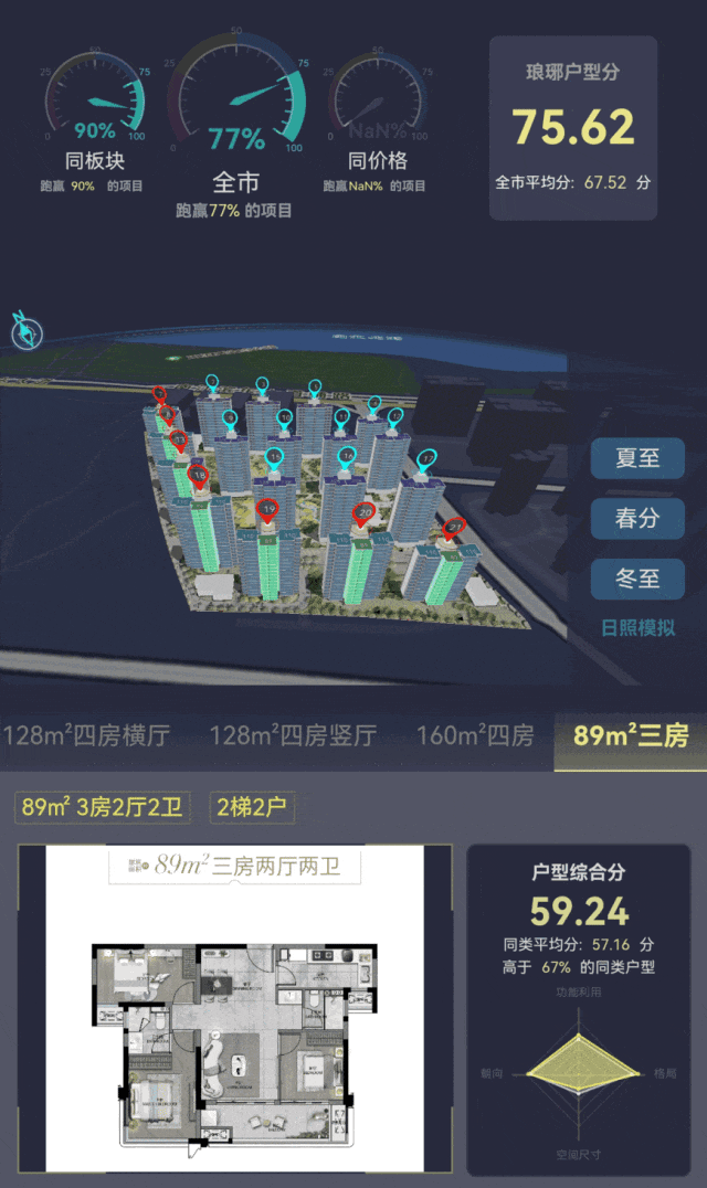 项目产品以刚需产品为主,两梯三户,其中89㎡中间户三房产品做三开间朝南,增加采光面,但南北不通透;109平的端头户型,带双面宽阳台;7#和13#的128㎡横厅四房,两梯三户,三面采光,南侧带转角阳台;128㎡竖厅和160㎡四房,均为两梯两户产品,其中160㎡带约9.5米的大阳台,尺度阔绰,但存在一个暗卫,算是小小的遗憾。
